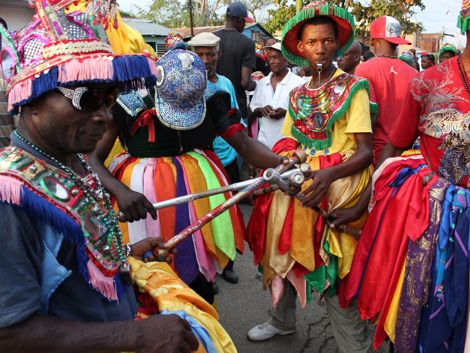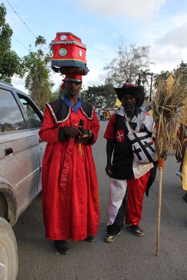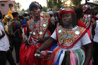 After greeting the inanimate beings, the Gaga continues its course, the queens sensually dancing and visit the homes of people who belong to the in the family of worshipers, voodoo society members and other relatives. At these Tops majors, with their tin batons in hands and others with machetes twirl them with dexterity through their hands delighting observers, after which the queen will pass the treassury box asking for donations.